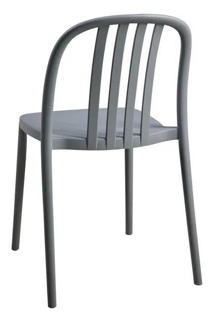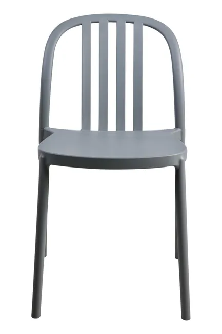 Set di quattro sedie grigie da esterno in polipropilene, impilabili per un facile stoccaggio e trasporto. Con un design moderno e resistente alle intemperie, sono perfette per l’uso all’aperto.